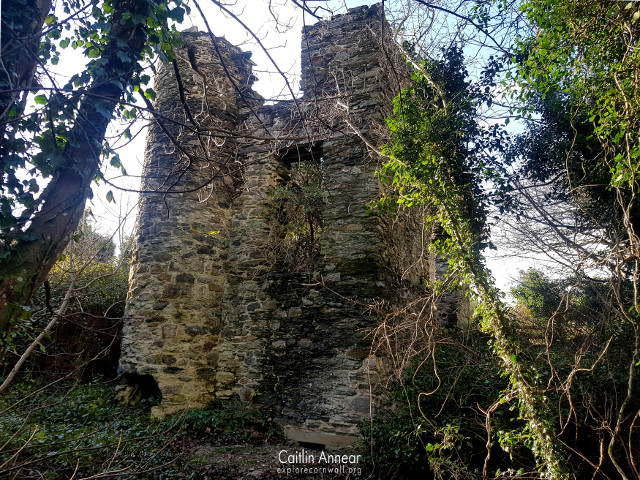 Remains of the winding engine house hidden in the Cornish jungle. This house was actually built before the pumping engine and is a rare find as its beam was houses inside the engine house. The whim worked a separate shaft slightly to the east; this has been left by the council to become overgrown and obscured to restrict public access. East shaft reached 100-fathoms (183m).